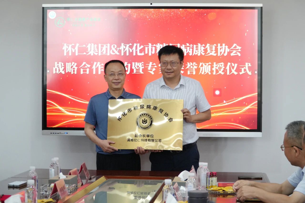 懷化市糖尿病協(xié)會(huì)為懷仁集團(tuán)旗下的湖南億仁科技有限公司授牌“懷化糖協(xié)副會(huì)長(zhǎng)單位”,億仁科技總經(jīng)理王浩上臺(tái)接受牌匾。