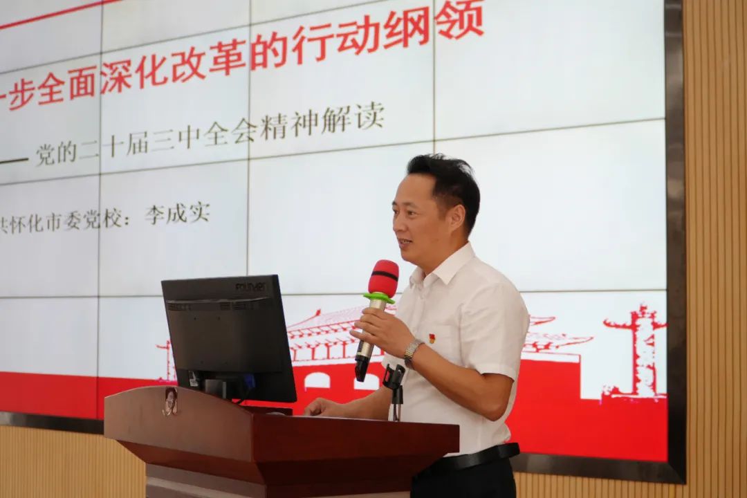 大會特別邀請到鶴城高新區(qū)黨工委書記舒軍,帶來精彩生動的宣講內容《學習貫徹黨的二十屆三中全會精神》,他深入淺出的宣講方式和貼近生活的示例說明,為在座的同志進一步的學習打下基礎;市委黨校科研部部長李成實教授則以嚴謹?shù)慕虒W內容,組織大家學習課程《新征程上進一步全面深化改革的行動綱領---黨的二十屆三中全會精神解讀》,帶來了一場精彩的黨課教育。