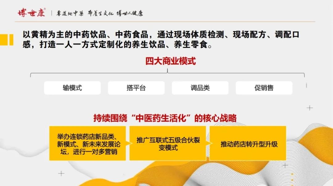 博世康商業(yè)模式可以概括為“輸模式、搭平臺、調(diào)品類、促銷售”的全方位服務(wù)模式,不僅提供傳統(tǒng)的中藥飲片,還針對市場需求,研發(fā)和推廣中藥生活化品類。博世康在藥店提供以黃精為主的中藥飲品、中藥食品,通過現(xiàn)場體質(zhì)檢測、現(xiàn)場配方、調(diào)配口感,打造一人一方式定制化的養(yǎng)生飲品、養(yǎng)生零食。未來3-5年,公司持續(xù)圍繞“中醫(yī)藥生活化”的核心戰(zhàn)略,舉辦連鎖藥店新品類、新模式、新未來發(fā)展論壇進(jìn)行一對多營銷,推廣互聯(lián)式五級合伙裂變模式,推動藥店轉(zhuǎn)升型升級。