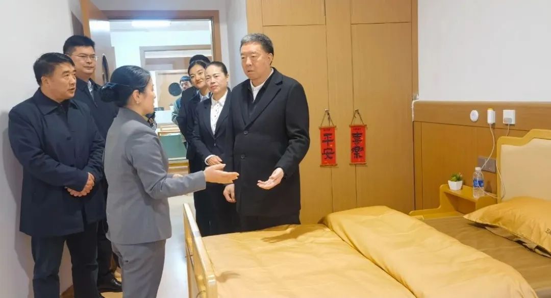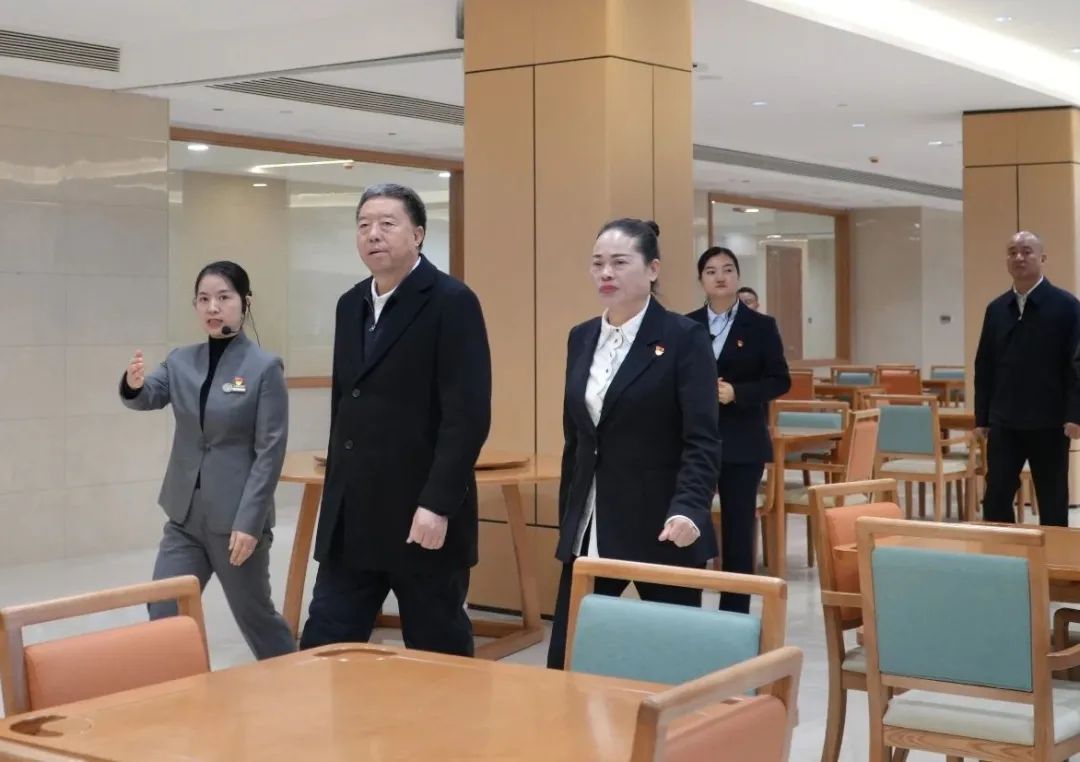 在康養(yǎng)苑五樓活力長者居住區(qū),毛萬春主席參觀了樣板間、綜合活動室、功能室、閱讀室、太極瑜伽練功房、樂器室、健身房等,詳細詢問了智能系統(tǒng)、配套功能設(shè)施、服務收費等。走在懷仁五調(diào)康養(yǎng)園的連廊里,環(huán)境雅致,綠樹環(huán)繞,文化氣息濃厚,令人愉悅。毛萬春主席微笑地說:“這里關(guān)起門是家,推開門是花園。”